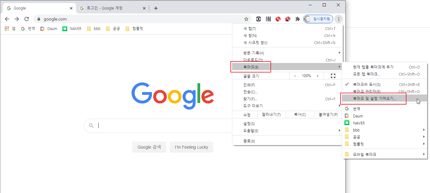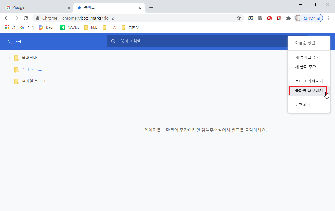 크롬 브라우저의 북마크 바에 가져온 북마크가 생성된 것을 확인합니다.