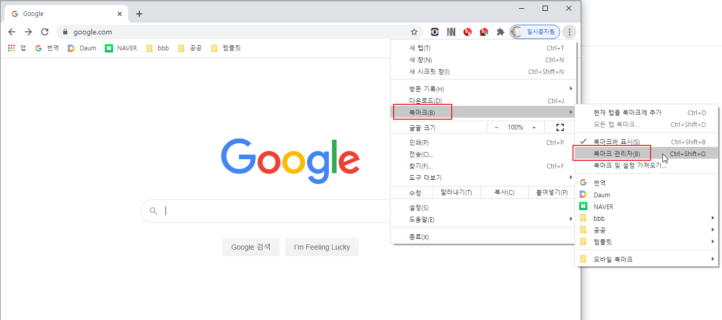 북마크 -> 북마크 관리자를 클릭합니다.